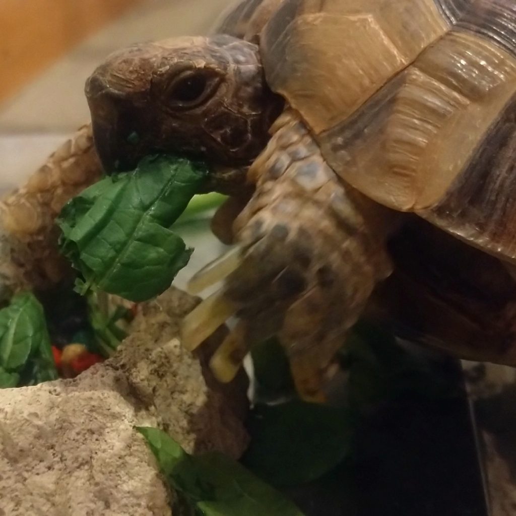 最近、野菜を食べないリクガメのオリーブですが、自家栽培のカブの葉とリクガメフードをよく食べています。